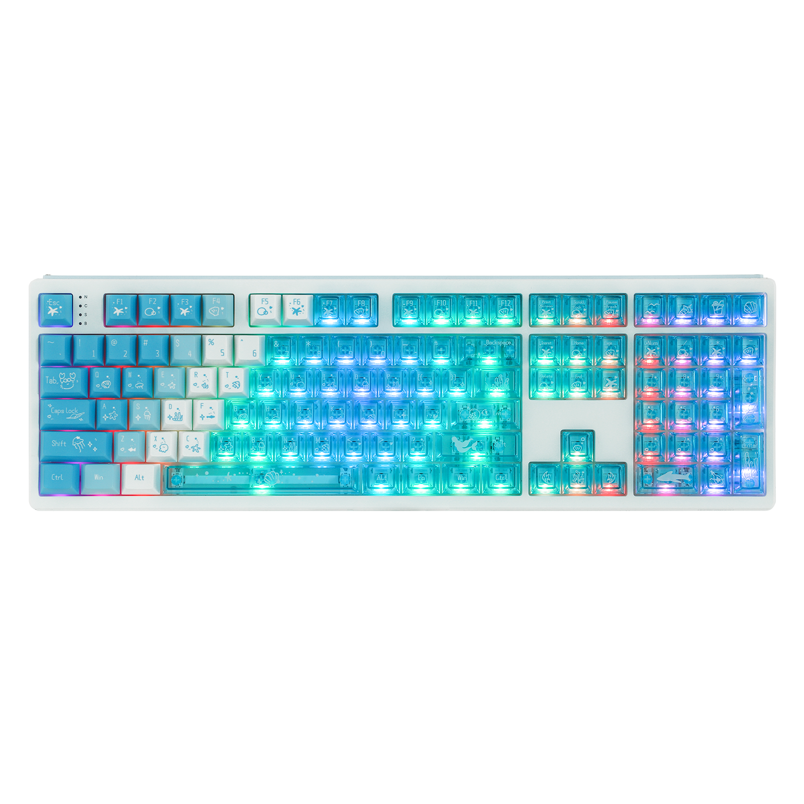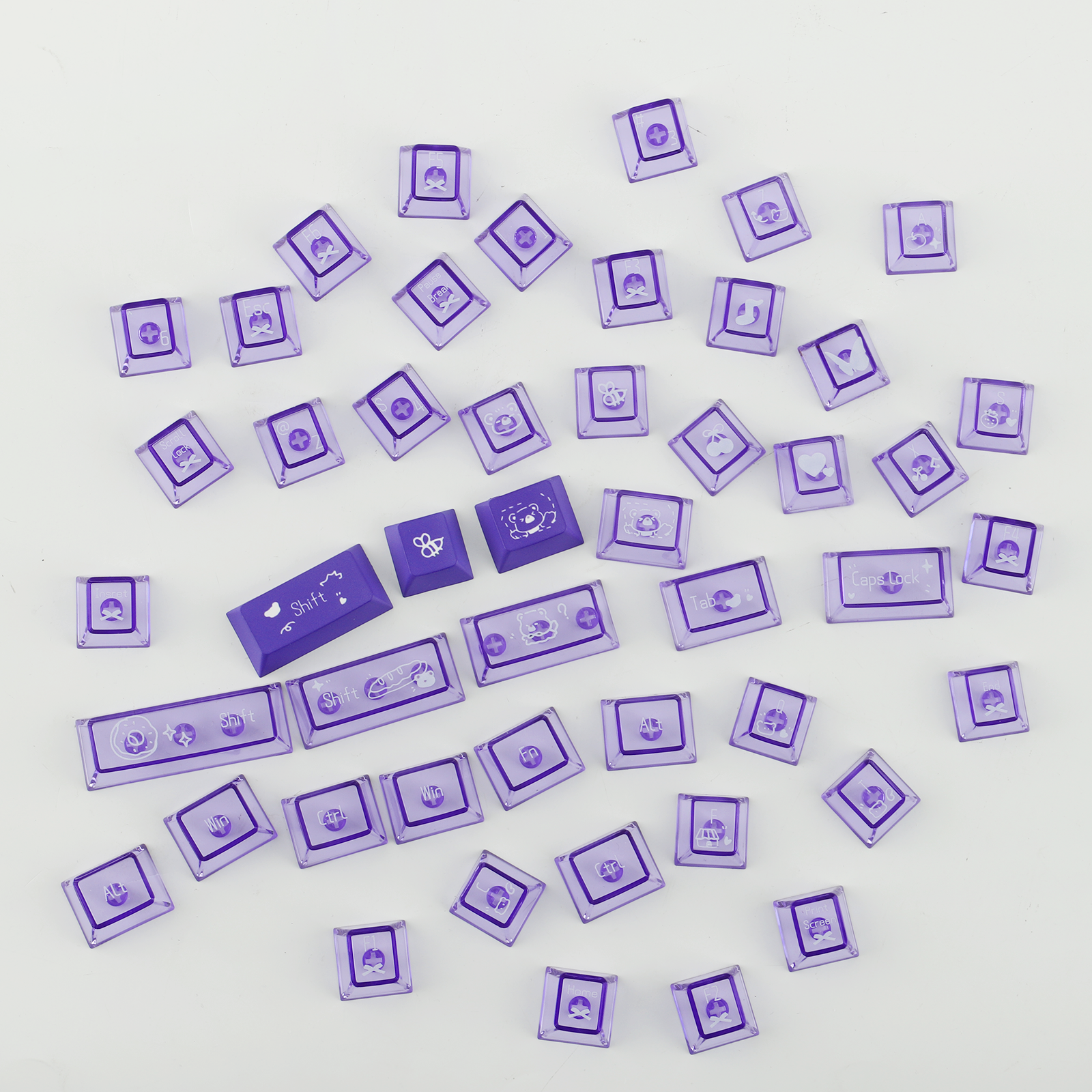 The non-shine-through keycaps are made from durable PBT material, offering excellent wear resistance and oil stain resistance. The shine-through keycaps are crafted from transparent PC material, effectively enhancing the backlighting for a stunning visual experience. With distinct tactile feedback and striking aesthetics, these keycaps add a unique charm to your keyboard.