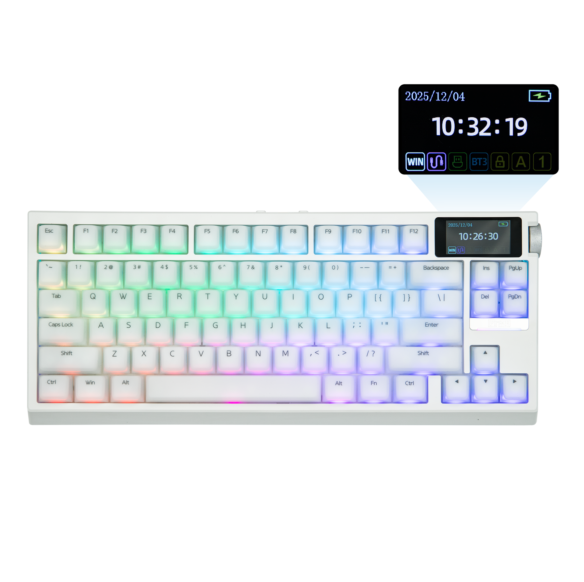 More Information...Check vitals such as battery level, time, and keyboard status on the info page, or turn your keyboard into a unique piece of desk art with a dedicated GIF page for animations, doodles or GIFs, all easily uploaded via the web-based software. Double as a control panel for RGB setup, the dual-function Volume Knob can also be used to control the screen (FN+Knob to swap), to browse the screen for backlight customization.